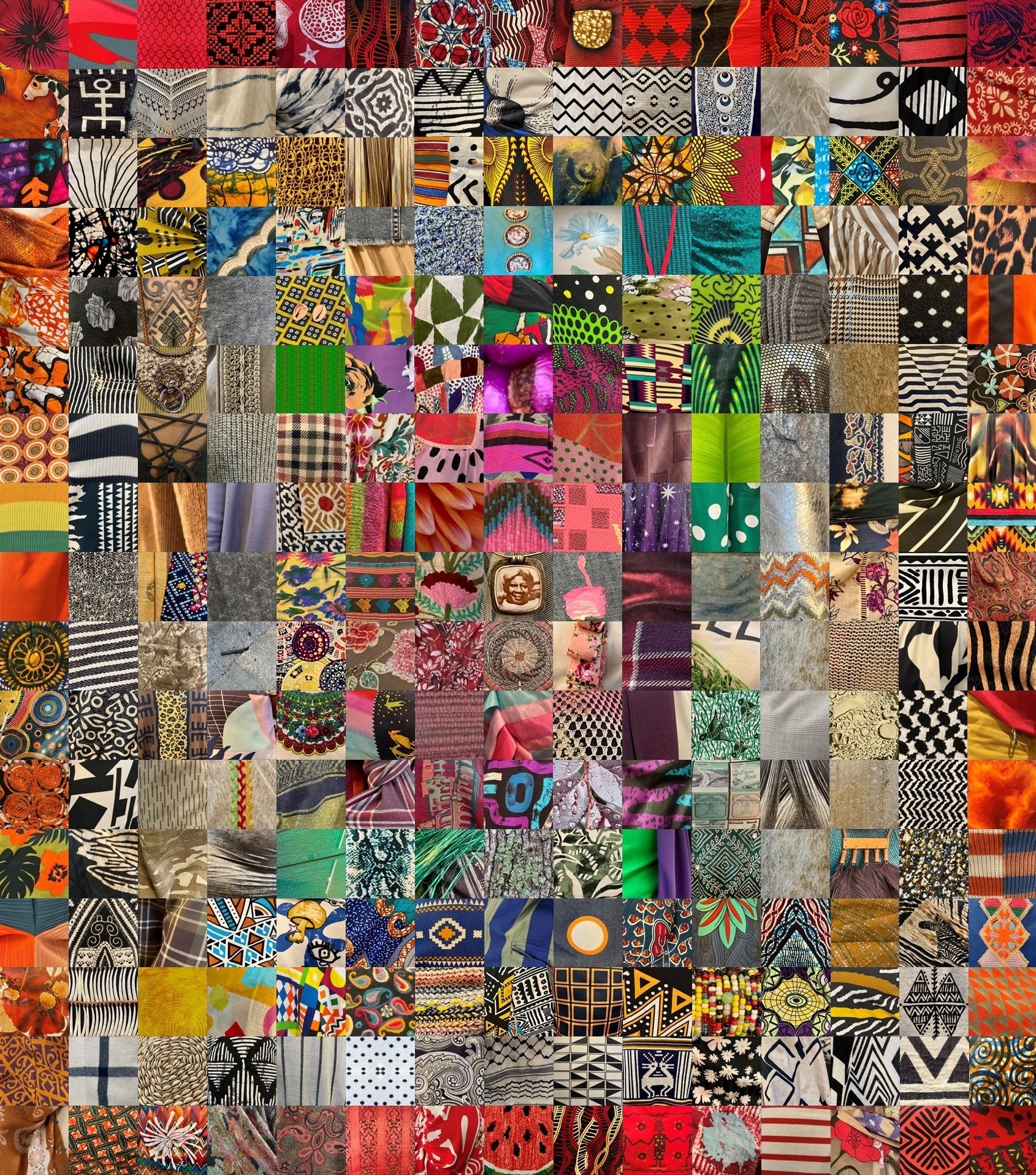 Featuring 255 squares this digital quilt contains kufis and ball caps, ceremonial skirts and saris, leather and fringe, moss, tree bark, and rain. Whale bone and wax print. Fans and head wraps, a purse that a mother made with care, a well-loved gift from a friend. Pils and pet hair, wrinkles and stains, tattoos and melanin, bogolan and baby clothes, kente, cotton, metal and silk. Flowers, foliage, and fabrics from conference organizers, volunteers, event space staff, and even parts of the building where the Iranti Ẹ̀jẹ̀ conference was held.
